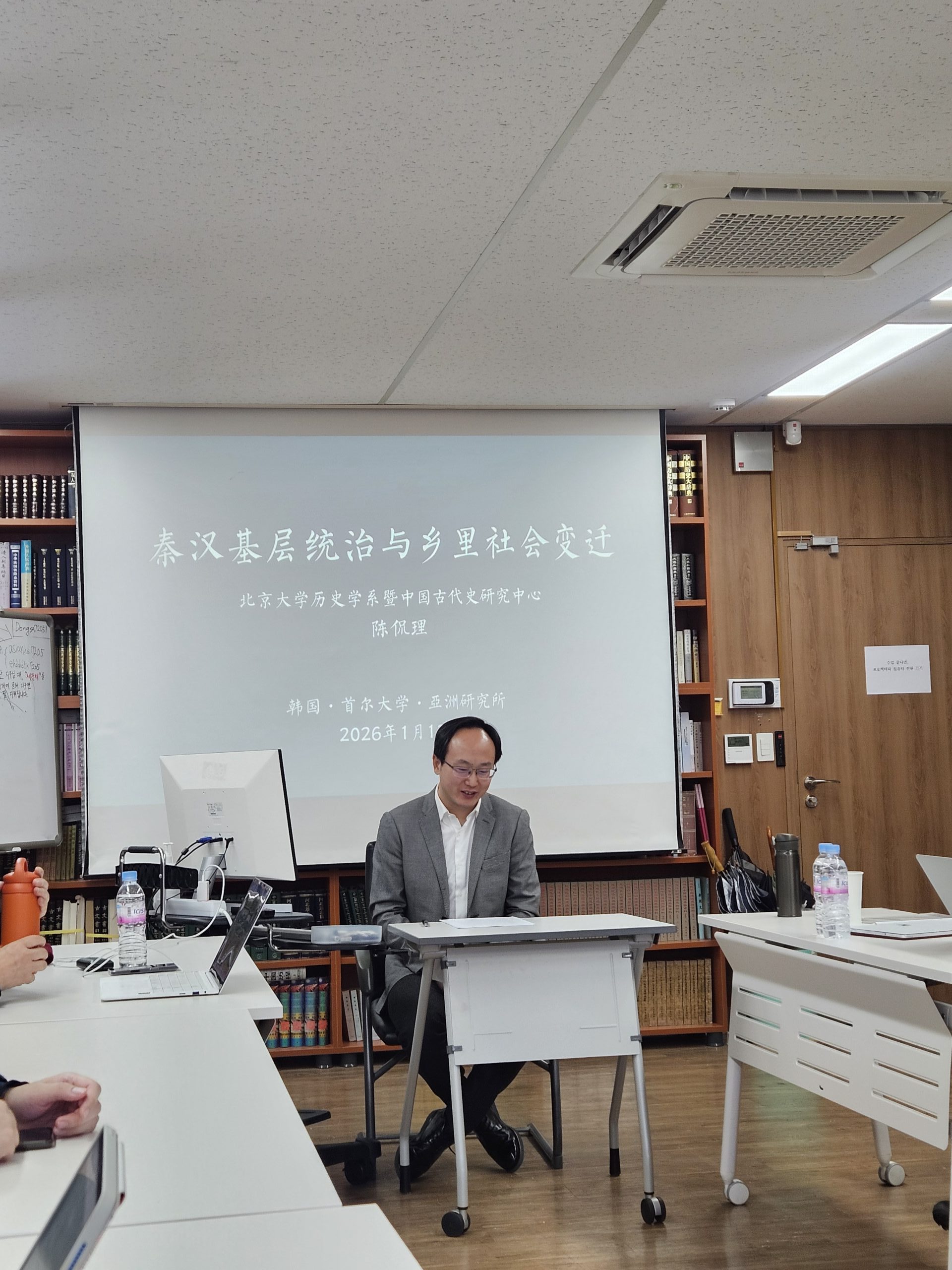 2026년 1월 13일, 오후 2시~5시에 걸쳐 중국 북경대학교 교수 진간리(陳侃理) 선생님의 강연 및 질의응답이 진행되었다. 강연에서 발표자는 진한 제국의 편호제민 체제가 실제로는 어떤 향리 조직을 통해 기층에 작동했는지, 그리고 그 과정에서 “鄕里社會”라는 특수한 사회구조가 어떻게 형성·변화했는지를 추적하였다. 먼저 ‘里’는 자연취락을 기본 단위로 하는 취락 공동체이고, ‘鄕’은 여러 취락을 포괄하는 행정·영역 단위라는 점을 구분한 뒤, 진·한 시기 지방통치가 이 둘을 통해 서로 다른 방식으로 사회와 접촉했음을 보여주었다. 그중에서도 里吏, 父老 등 관료제의 말단에 속해 있으면서 세금·역역·호적·치안 관리 등의 실무를 맡았던 존재에 대해 설명하였다. ‘향’은 일반 聚落에서 출발해, 점차 군현 아래의 정규 행정 구역으로 변하며, 여러 기관을 포괄하는 향역 사회를 형성하고였다. 나아가 발표자는 그 과정에서 여러 취락에 걸친 대토지 소유와 화폐경제를 매개로 世家大族이 성장하였다고 지적하였다.